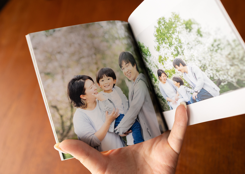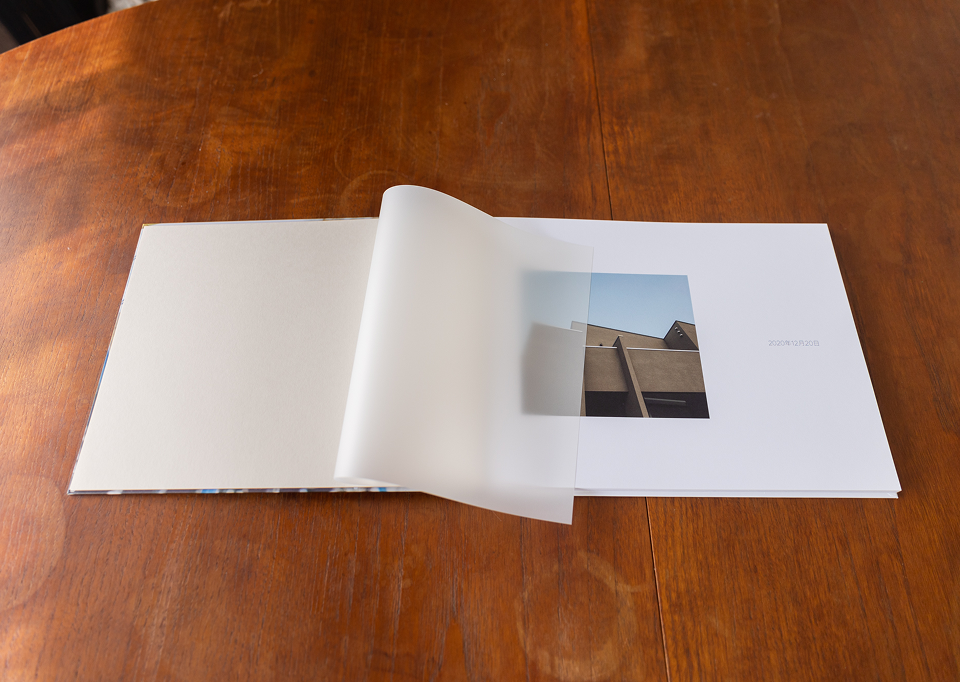 マットな質感の表紙に、中はさらりとした薄手の紙がフラットに開くタイプのフォトブックです。